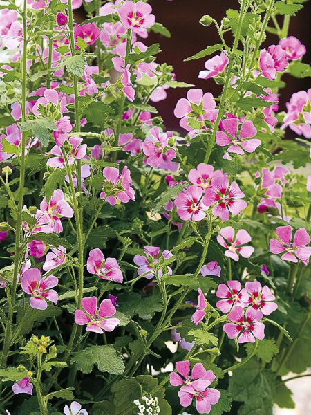 Variété de mauve arbustive exceptionnellement florifère sur une longue période. Ses fleurs sont rose vif, à cœur rouge. Elle peut fleurir toute l'année si les conditions sont bonnes. Croissance rapide.