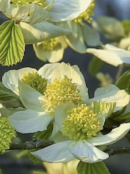Proche des hamamélis, cet arbuste mériterait d'être plus connu. Ses fleurs sont entourées de grandes bractées blanches. Son feuillage prend de belles teintes écarlates en automne.
