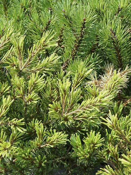 Nain, port globuleux, aplati. Courts rameaux portant des touffes denses d'aiguilles longues, turbinées, vert tendre. Croissance très lente.
