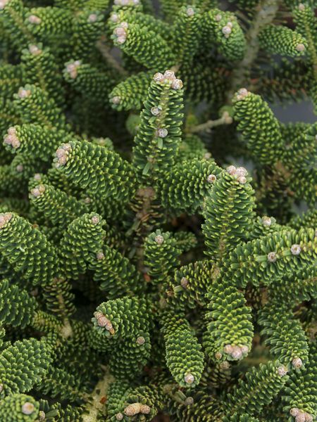 Nain à port pyramidal large. Feuilles très courtes, vert foncé. Croissance très lente.