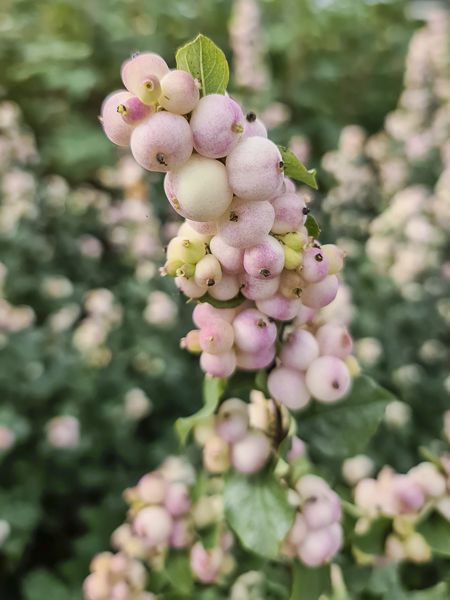 Compact et dense. Nombreuses et minuscules fleurs blanches, suivies de grappes de fruits blancs teinté de rose, persistant jusqu'en hiver.