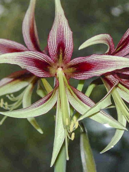 Fleurs aux pétales effilés, bordeaux, strié de vert pâle.