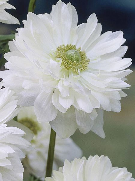 Les fleurs de cette anémone des fleuristes sont bien doubles, blanc uniforme.