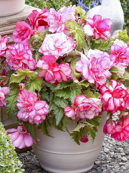 Grandes fleurs doubles, roses et blanches très ornementales au port retombant, pour suspensions et vasques. Encore appelés "Pendula géants à fleurs doubles", ils sont beaucoup plus florifères que les "Pendula" ordinaires.