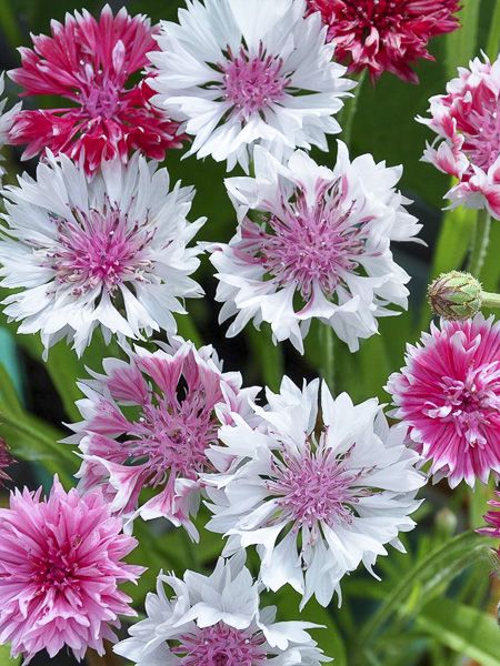 Bleuets à fleurs semi-doubles en mélange de couleurs du blanc au rose pourpré, parfois bicolores. Couper les fleurs fanées pour provoquer une remontée de fleurs.