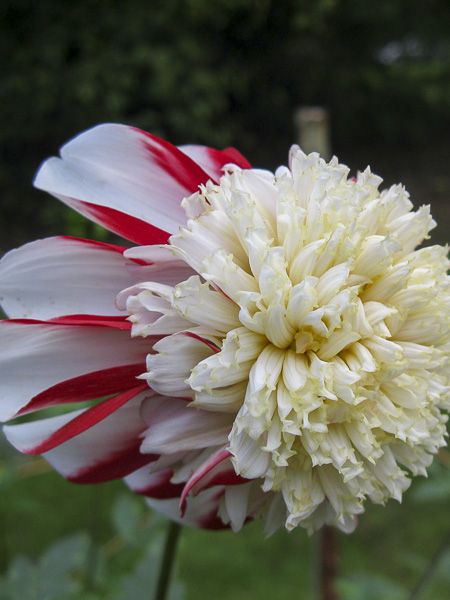 Dahlia à fleurs d'anémone de 10 cm de diamètre, aux pétales retombants blancs, rayé de rouge surmontés d'un gros cœur crème à pétaloïdes enroulés. Original.