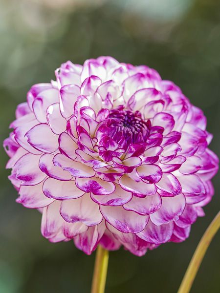Dahlia aux fleurs en boule, de 7 cm de diamètre, blanc panaché de rose pourpré.