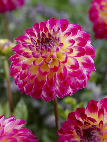 Dahlia aux fleurs en pompon, de 8 cm de diamètre, rose purpurin à base jaune.