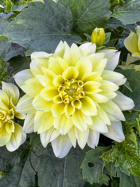 Dahlia nain aux fleurs de cactus de 8 cm de diamètre, jaune citron au centre, palissant sur les bords.