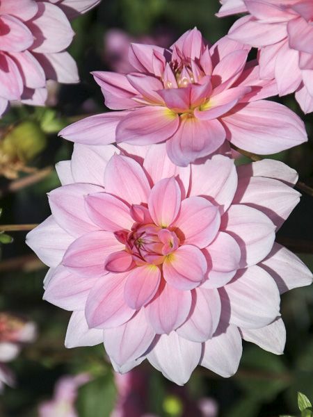 Dahlia aux fleurs semi-doubles, de 14 cm de diamètre, rose dragée.
