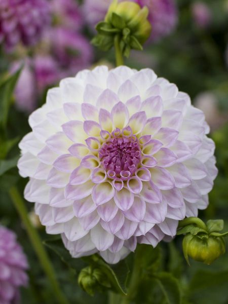 Dahlia aux fleurs très doubles de 9 cm de diamètre, aux ligules imbriquées, rose lavande à base blanche.