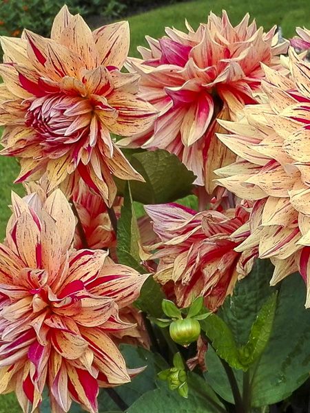 Dahlia aux grosses fleurs doubles, de 20 cm de diamètre, abricot, chamarré de rouge.