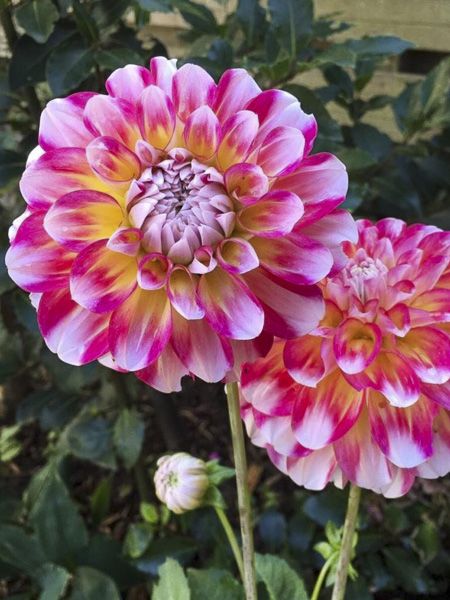 Dahlia décoratif aux fleurs de 15 cm de diamètre, très doubles, aux ligules rose framboise chamarré de blanc et de jaune crème.