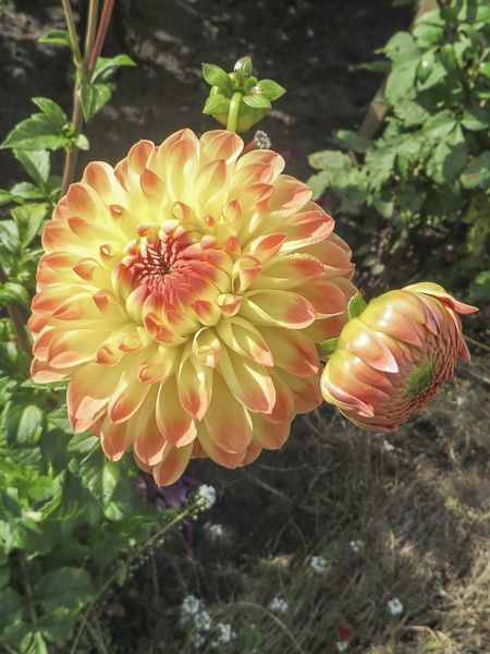 Fleurs sphériques, très doubles de 6 cm de diamètre, aux ligules imbriquées, enroulées, jaunes à pointe orange.
