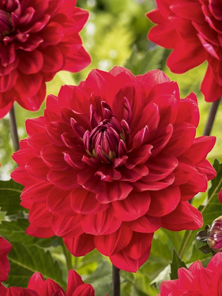 Dahlia de la série Karma développée pour leur bonne tenue en vase, aux fleurs bien doubles, de 12 cm de diamètre, aux ligules imbriquées, rouge vermillon.