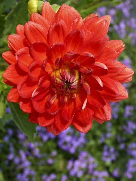 Dahlia de la série Karma développée pour leur bonne tenue en vase, aux fleurs doubles, de 12 cm de diamètre, aux ligules rouge orangé écarlate.