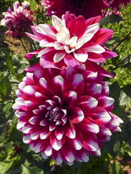 Fleurs bien doubles, de 12 cm de diamètre, aux ligules imbriquées, rouge pourpré contrastant avec les pointes blanches.