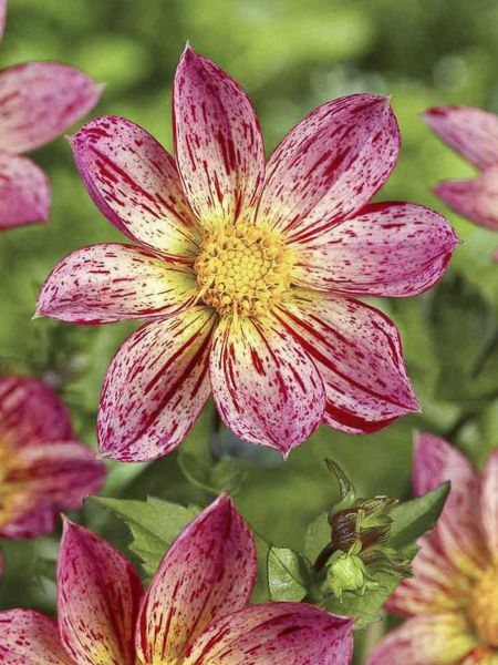 Dahlia semi-nain de la série Lucky aux fleurs simples de 9 cm de diamètre, aux ligules rose pâle pictées et maculées de pourpre, à base jaune d'or.