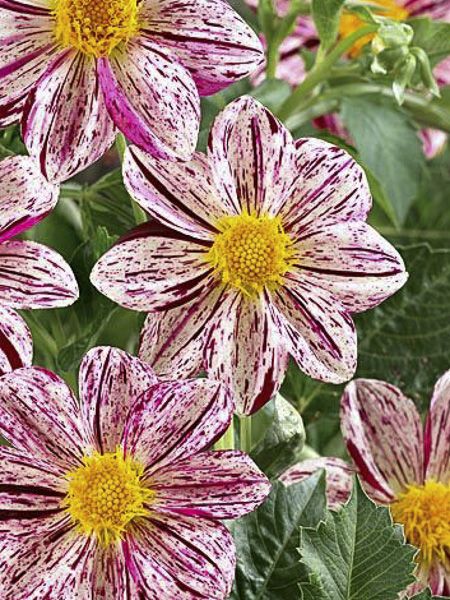 Semi-nain. Fleurs simples de 8 cm de diamètre, aux ligules rose très pâle pictées et maculées de pourpre à magenta.