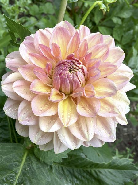Dahlia aux fleurs bien doubles de 12-15 cm de diamètre, aux ligules rose tendre, abricot et jaune, pourpré au centre.