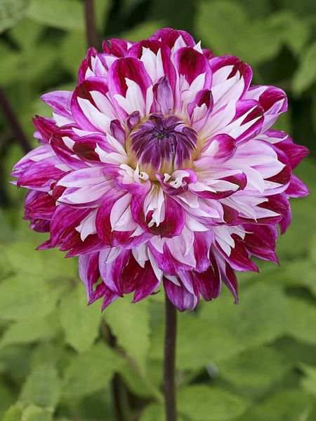Dahlia aux fleurs très doubles de 15 cm de diamètre, aux ligules imbriquées, rose violacé et pourpre, intercalées de ligules blanches.