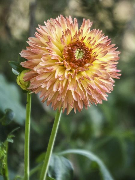 Fleurs très doubles de 15 cm de diamètre, aux ligules imbriquées, ondulées et dentées, orange saumoné et jaune.