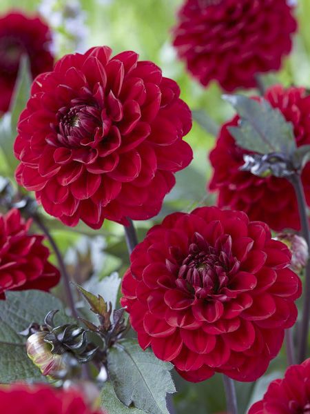 Dahlia de la série Senior aux fleurs très doubles, en boule de 8 cm de diamètre, aux ligules imbriquées, rouge profond. Feuillage bronze pourpré.