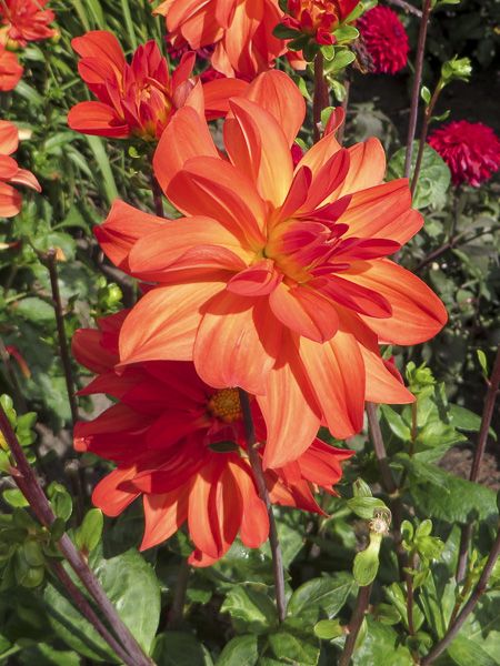 Dahlia aux fleurs plates, semi-doubles de 8 cm de diamètre, aux larges ligules orange-rouge écarlate.