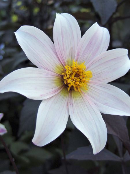 Dahlia à fleurs simples, de 10 cm de diamètre, aux larges ligules blanches, discrètement veiné de magenta en contraste avec le feuillage chocolat sombre.