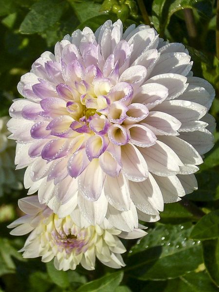 Dahlia aux fleurs en boule plate, très doubles de 10 cm de diamètre, aux ligules imbriquées et enroulées, blanches, ourlé de lavande au centre de la fleur.