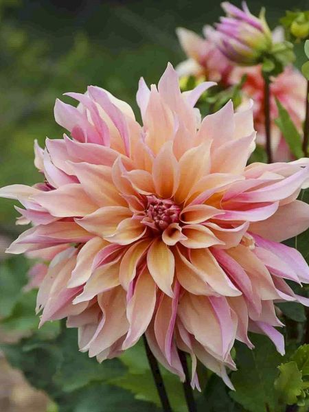 Fleurs doubles de 25 cm de diamètre, aux ligules ondulés, abricot flammé de lilas.