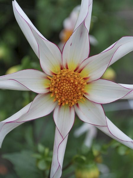 Dahlia de la gamme honka aux fleurs simples de 9 cm de diamètre, aux ligules étroites et enroulées, blanches avec un liseré pourpre.
