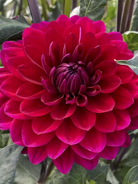 Dahlia nain, aux fleurs doubles de 10 cm de diamètre, rouge cerise.