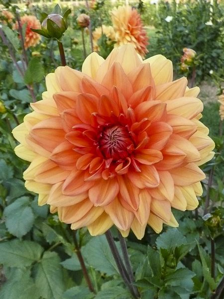 Dahlia nain et compact, aux fleurs doubles de 5 cm de diamètre, orange à ocre.