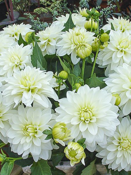 Ces dahlias nains à fleurs doubles aux pétales larges (forme décorative) présentent une végétation compacte qui se prête parfaitement à la réalisation des bordures, massifs bas et plates-bandes ou encore de potées fleuries. Hauteur de 35 à 70 cm. Diamètre des fleurs de 7 à 14 cm. Densité de 6 à 8 au m2.