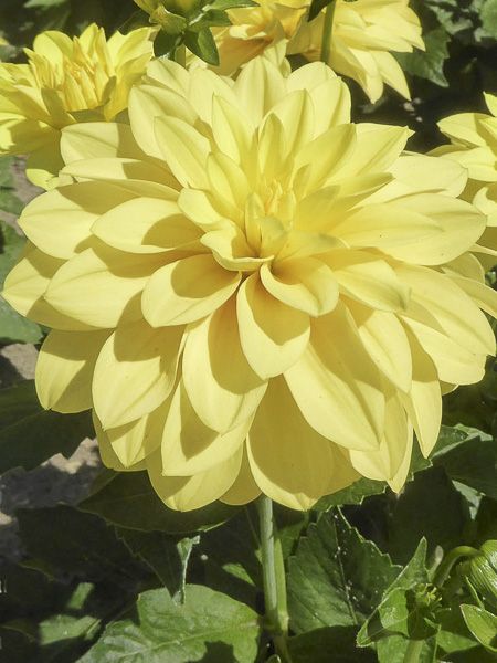 Dahlia nain et compact de la série 'Gallery', aux fleurs doubles de 7 cm de diamètre, jaune lumineux.