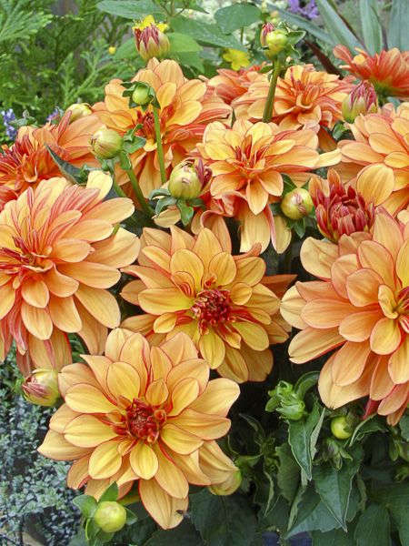Ces dahlias nains à fleurs doubles aux pétales larges (forme décorative) présentent une végétation compacte qui se prête parfaitement à la réalisation des bordures, massifs bas et plates-bandes ou encore de potées fleuries. Hauteur de 35 à 70 cm. Diamètre des fleurs de 7 à 14 cm. Densité de 6 à 8 au m2.