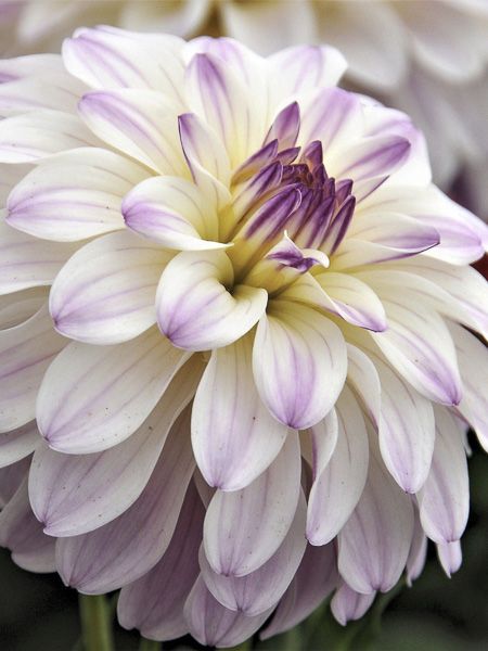 Dahlia nain et compact de la série 'Gallery', aux fleurs doubles de 7 cm de diamètre, blanches à reflets lavande pourpré.