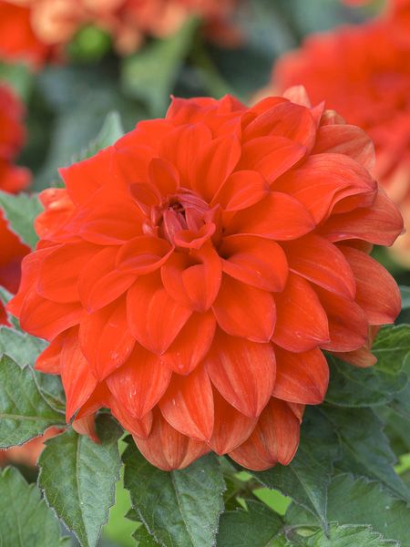 Dahlia nain et compact de la série 'Gallery', aux fleurs doubles de 7 cm de diamètre, orange écarlate.