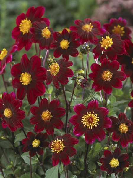 Dahlia nain et buissonnant de la série Topmix, à fleurs simples de 5 cm de diamètre, rouge pourpré sombre à reflets magenta et cœur jaune.