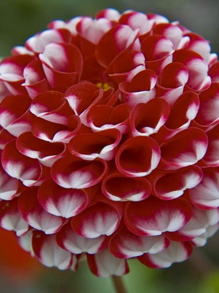 Fleurs en pompon, de 9 cm de diamètre, bicolores, rouge profond et blanc.