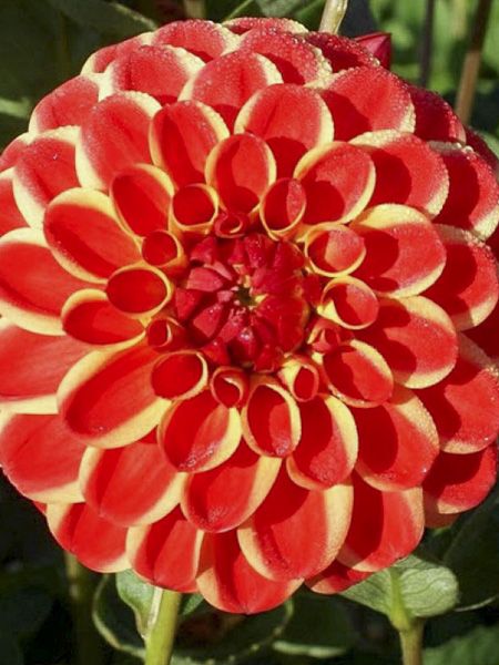 Dahlia aux fleurs en pompon, de 7 cm de diamètre, aux pétales rouge vermillon, bordé de jaune d'or.