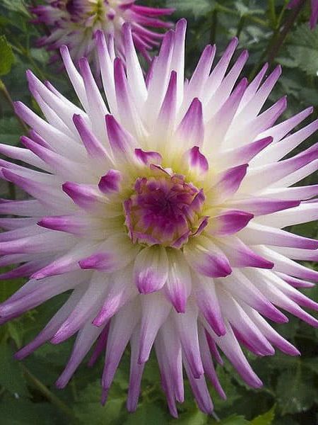 Dahlia semi-cactus aux fleurs de 12 cm de diamètre, blanches, à pointes des ligules magenta.