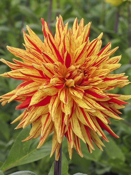 Dahlia semi-cactus aux fleurs de 17 cm de diamètre, jaune d'or strié de rouge vermillon.