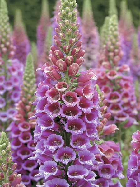Digitale de la série 'Mountain' aux hampes de fleurs tubulaires dirigées vers le haut, rose à mauve, à gorge pictée de blanc et de pourpre.