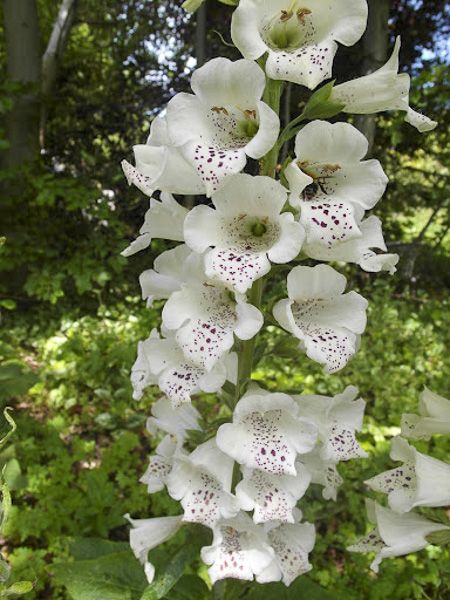 Digitale de la série 'Mountain' aux hampes de fleurs tubulaires dirigées vers le haut, blanches, à gorge ponctuée de brun pourpré.