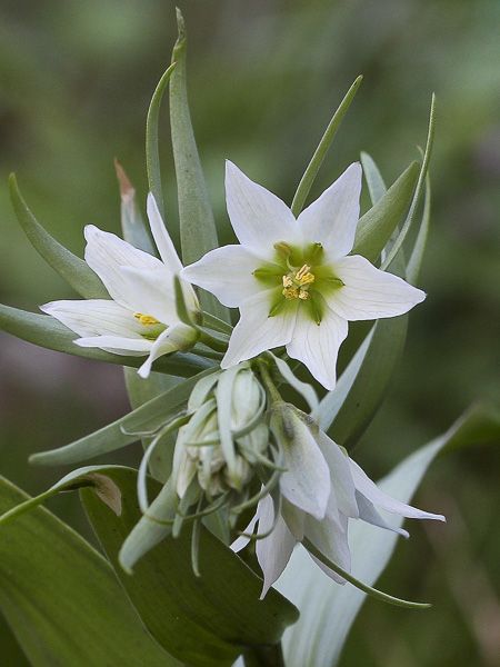 Vivace bulbeuse. Feuilles vert grisâtre, de 5-8 cm de long, lancéolées, ovales, opposées en bas des tiges, alternes en haut. Grappes de ± 10 fleurs de 1-2 cm de long, inclinées, en coupe large, aux tépales pointus, blanc veiné de vert.