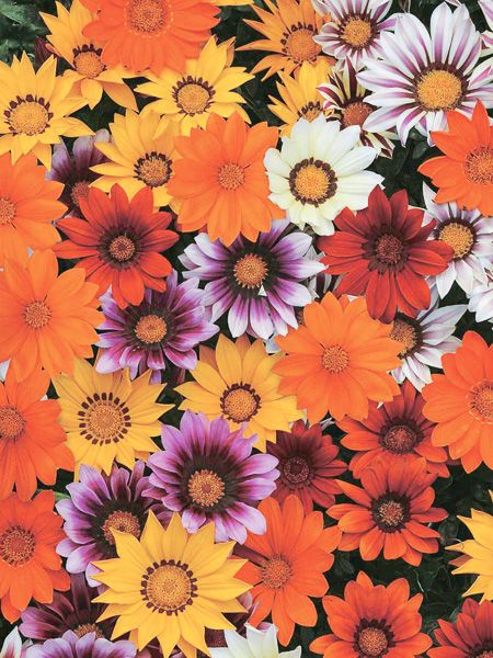 Gazania en mélange de couleurs orange, rouge, jaune, pourpre et blanc. Longue période de floraison. À cultiver en annuel.