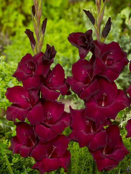 Glaïeul aux grandes fleurs rouge bordeaux très sombre, à partir de boutons noirs.
