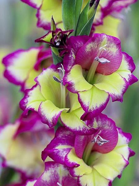 Glaïeul nain aux hampes florales très fournies en petites fleurs vert chartreux bordé de rouge pourpré.